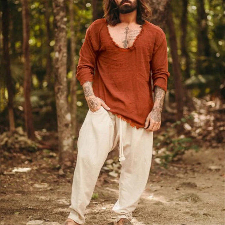 Ken – Chemise décontractée à col rond en couleur unie avec bords effilochés—